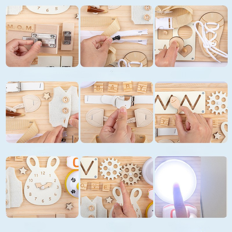 לוח העסוקה (Busy Board) נועד לאפשר לתינוקות ופעוטות לחקור מנגנוני פתיחה ונעילה שונים בצורה בטוחה, מהנה וחווייתית – ממש כמו בעולם האמיתי.
